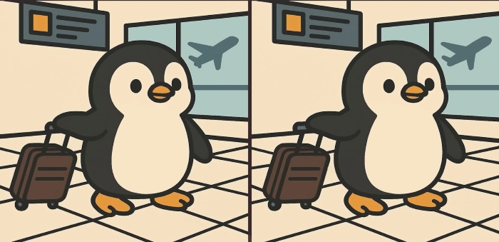 Tak čo, ste pripravení na ďalšiu výzvu? Pozrite sa pozorne na dva obrázky roztomilého tučniaka, ktorý nesie batožinu na letisku. Na prvý pohľad môžu vyzerať rovnako, ale skrývajú sa na nich tri malé rozdiely. Myslíte si, že ich všetky nájdete za 61 sekúnd? Vyskúšajte to a otestujte svoju ostrosť zraku!