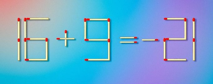 Na obrázku – nesprávna rovnosť zložená z 26 zápaliek: 16 + 9 = -21. Vašou úlohou je pretiahnuť iba jednu z nich, aby bola rovnosť správna.