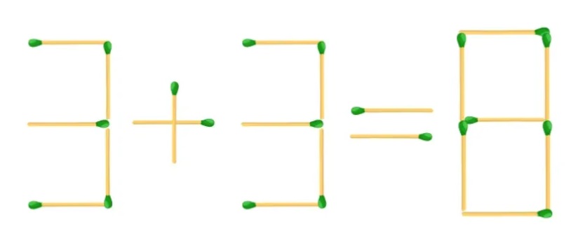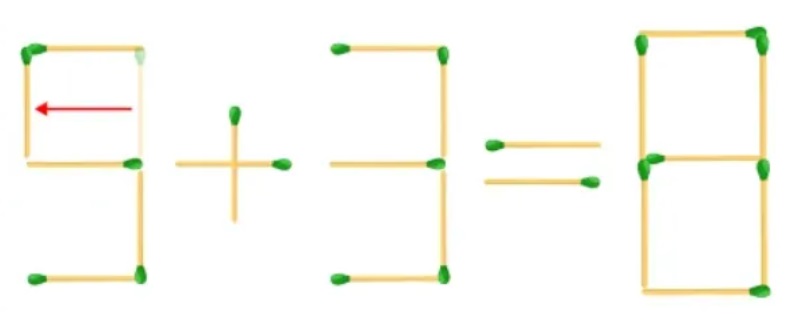 Tajomstvo spočíva v zmene tvaru čísel: stačí presunúť jednu zápalku tak, aby sa jedna z „trojok“ zmenila na „päťku“. Potom sa príklad stane absolútne správnym – 5+3=8.