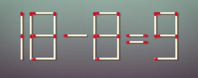 Nižšie uvidíte obrázok, na ktorom je rovnosť 18-8=9 rozložená pomocou zápaliek. Je zrejmé, že je to matematicky nesprávne, pretože rozdiel týchto čísel by mal byť 10.